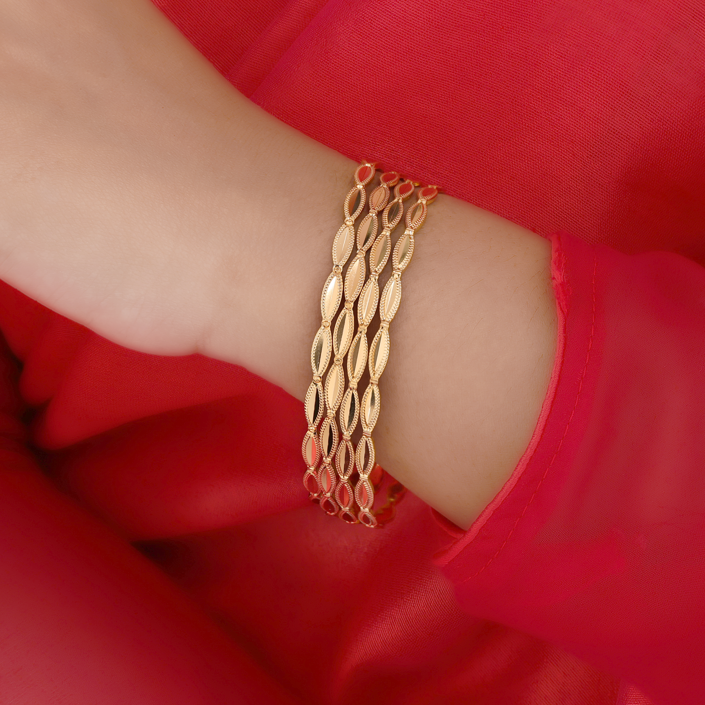 Discover elegance and style with Hakimi 22K Gold Plated Bangles. This premium set of 4 CNC design bangles is perfect for daily wear, wedding occasions, party wear, and fashion events. Crafted with high-quality brass and finished with 22K gold plating, these bangles offer a rich gold look while ensuring durability and long-lasting shine.
